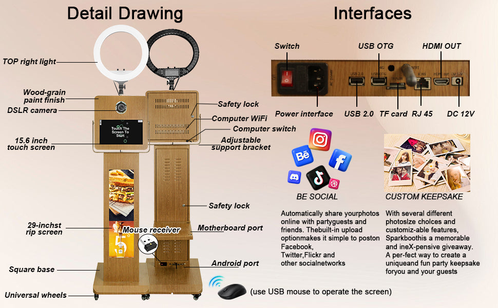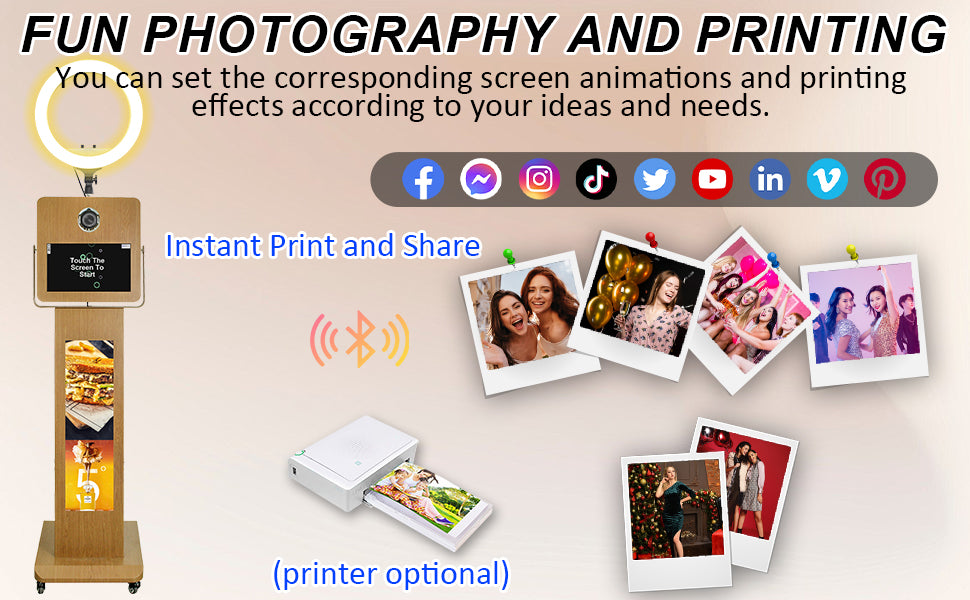 SHOOT,PRINT AND SHARE INSTANTLY: DSLR photo booth machine default software is DSLRBooth,support to instant print the photos and share by Email,SMS,Scan QR,Ins,Facebook,Tiktok,Twitter and more,Every guest can choose the way they want to share and save wonderful moments