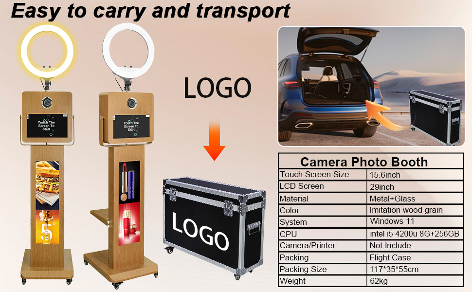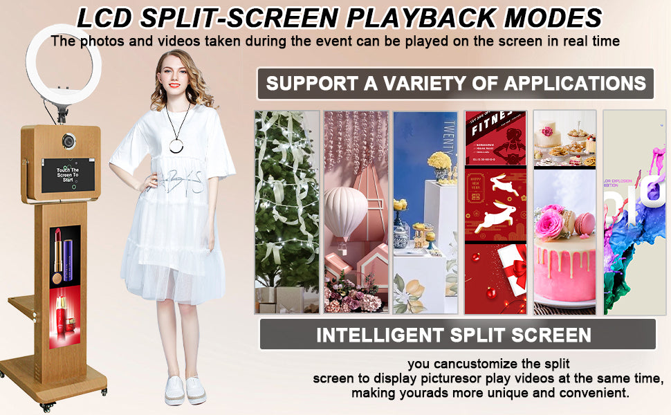 APP CONTROL LCD SCREEN: Upgrade LCD photo booth is designed with a large 29'' LCD screen supports mobile APP control.Up to 26 split-screen play styles,you can DIY Pictures,Videos,GIF,Text,Time Display and more on the app to display on the LCD screen.The pictures,videos on the mobile phone can be directly played on the screen,and the photos and videos taken during the event can also be played on the screen in real time