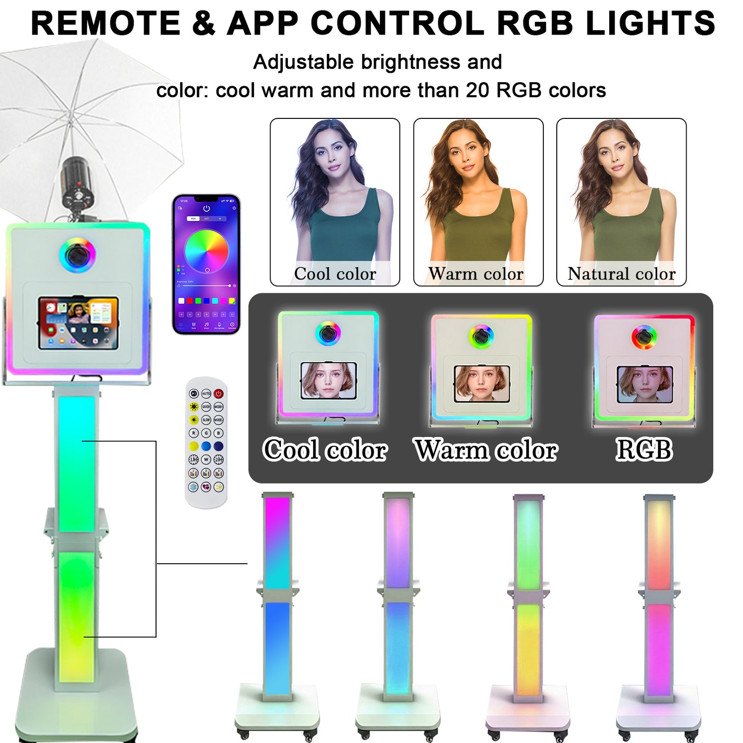 REMOTE CONTROL RGB LIGHTS: The protable photo booth for iPad has built-in RGB lights with more than 20 colors. You can use the remote control to adjust the color, support single color, mixed color or random changes. Make your photos more atmospheric.