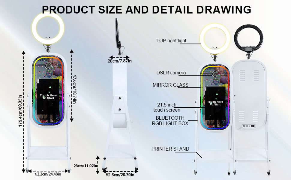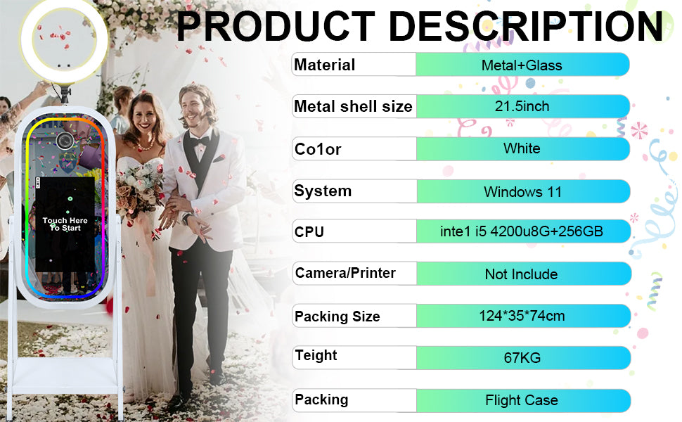 MIRROR GLASS AND TOUCH SCREEN: The Magic mirror photo booth machine comes 21.5in touch screen,Build-in mini PC(intel i5 8G+256G SSD) and supports Win10 system.High-resolution display,can zoom in,zoom out,flip,slide etc on the screen and pictures,easy to operate.Dustproof and Waterproof.
