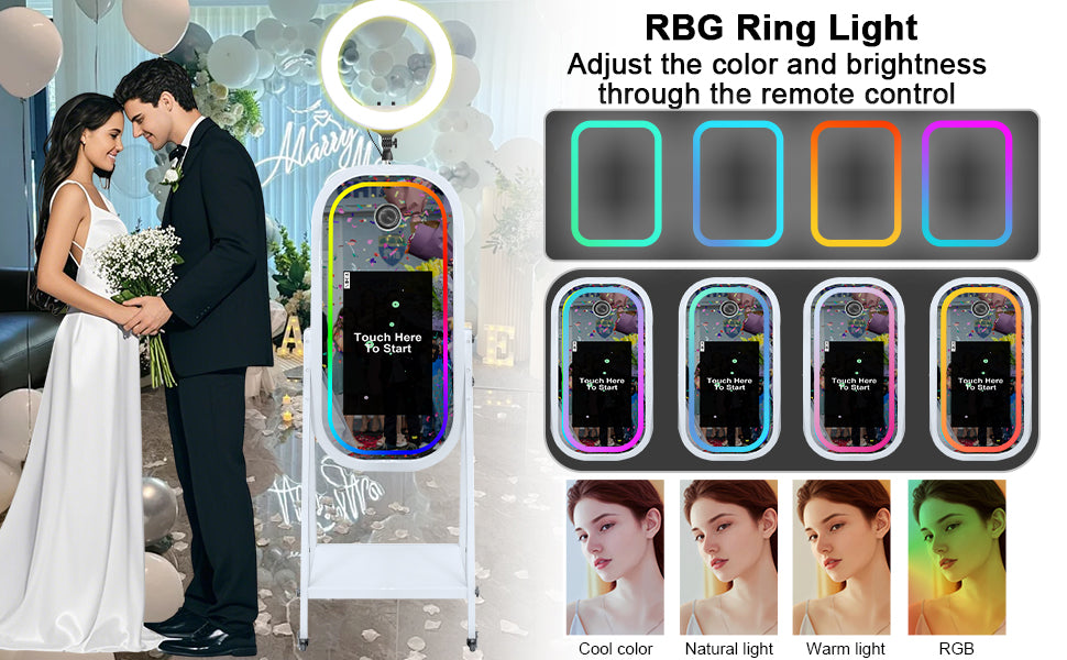 CONTROL RGB LIGHT: Photo booth digital with RGB frame light (4modes:Cold,Warm,Bright,RGB) by control,touch the screen and start taking pictures.Let it record your best moments.