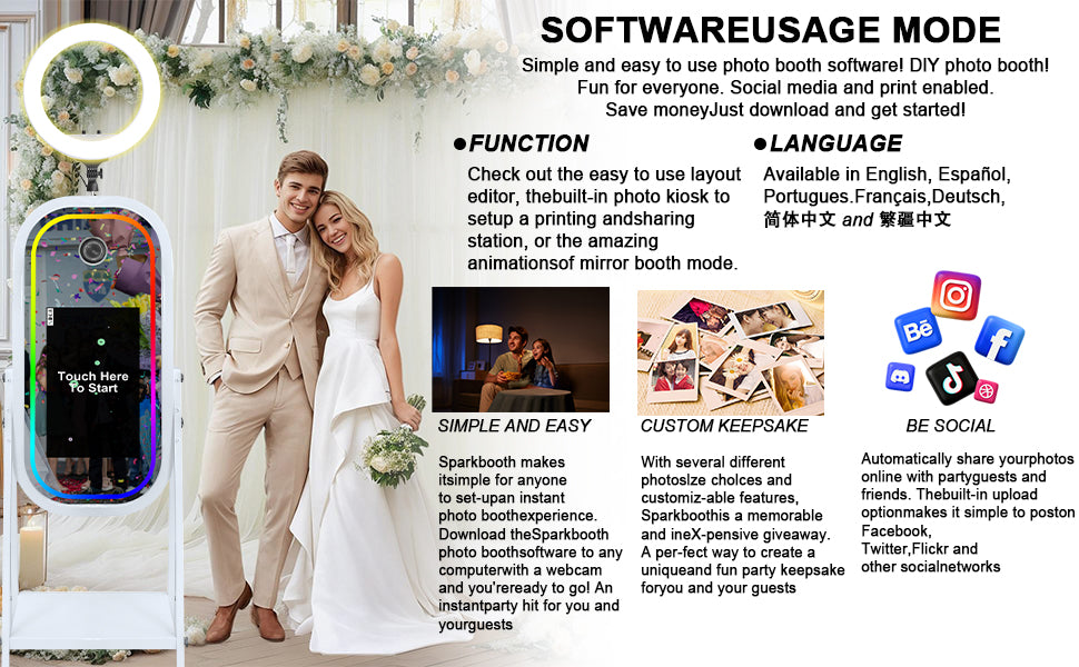 SHOOT,PRINT AND SHARE INSTANTLY: DSLR photo booth machine default software is DSLRBooth,support to instant print the photos and share by Email,SMS,Scan QR,Ins,Facebook,Tiktok,Twitter and more,Every guest can choose the way they want to share and save wonderful moments.