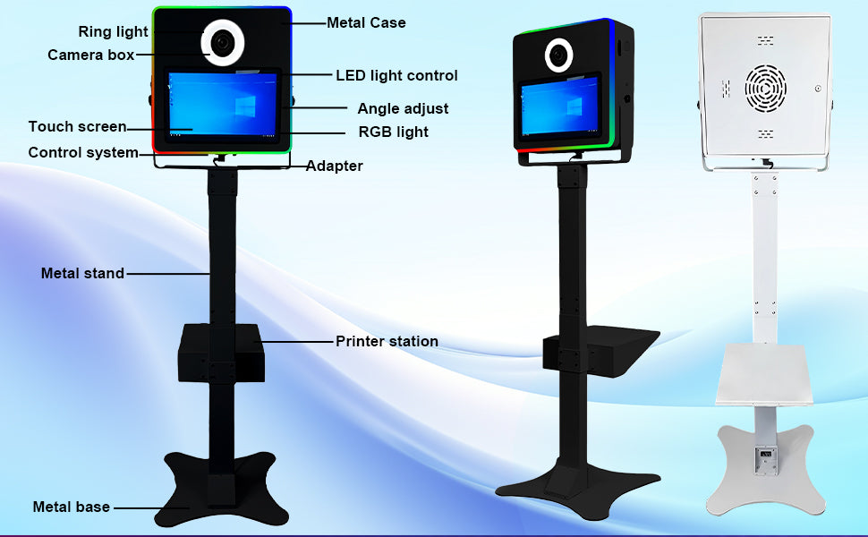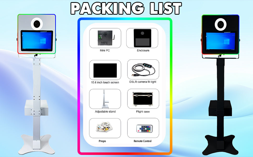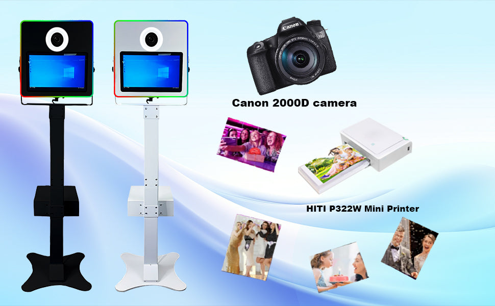 Unique Features: The portable photo booth designs with a 15.6 in touch screen in tempered glass, metal frame, RGB chasing lights and built-in capacitive touch technology with mini PC i5 4 Generation 8GB 256GB for DSLR Cameras. Simply touch the screen to shoot pictures and share it online instantly, which can also be printed through connected printers. (The listing contains the DSLR camera, printer and 108pcs 6" original photo papers to finish selfie and printing it out instantly)