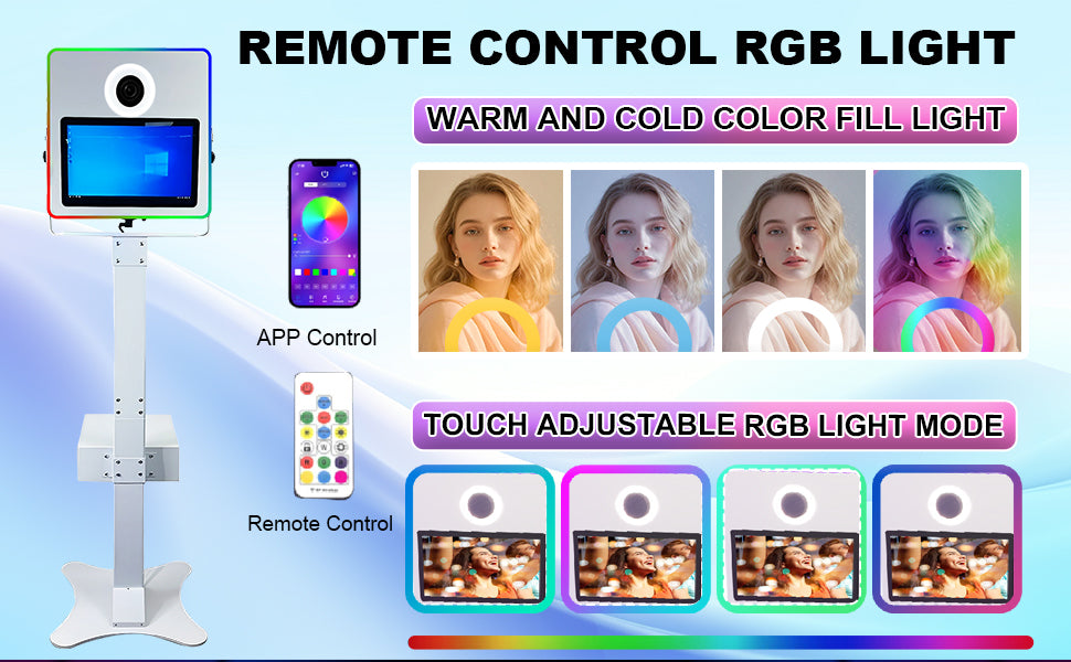 LED Photo Booth: The mirror photo booth designs a RGB light box on the stand to make colors in your pictures just for fun. You can adjust the brightness and colors as your preference. Also the lights will change with the rhythm of the music, which will sure to turn heads at events activities.