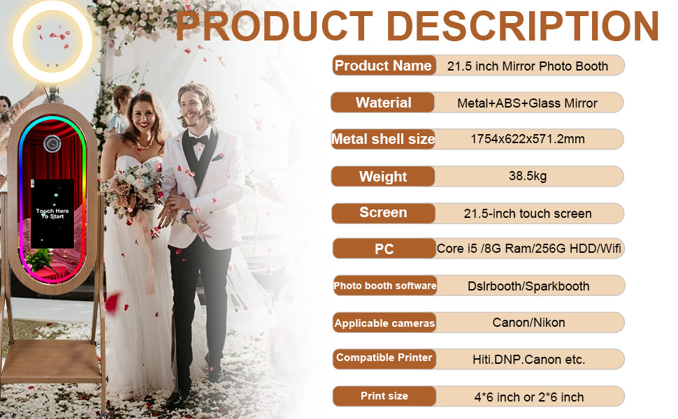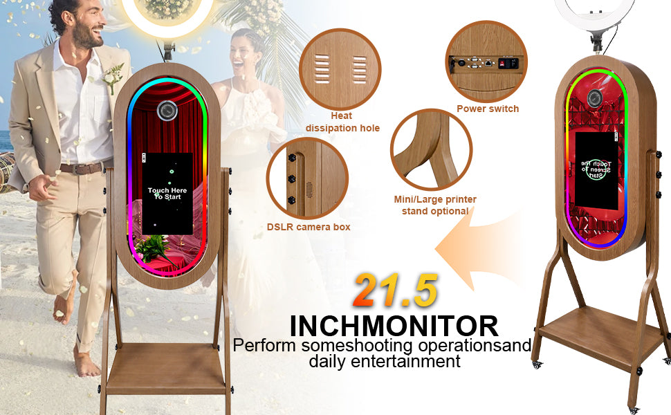 【MULTIFUNCTIONAL MIRROR PHOTO BOOTH MACHINE WITH SOFTWARE】 Mirror Photo Booth features a LCD screen with capacitive touch technology, suitable for DSLR cameras, with Canon/Nikon DSLR cameras, with RGB Fill Light. There is a multifunctional 21.5 inch LCD on the bracket with mini PC i5-8400 8GB RAM 256 SSD. Simply touch the screen to shoot pictures and share it online instantly, which can also be printed out through connected printers. (Camera and printer not included)