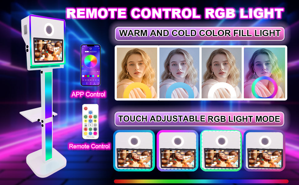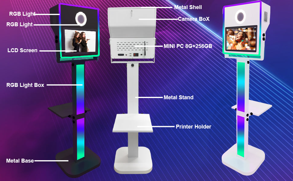 Unique Features: The portable photo booth designs with a 15.6 in touch screen in tempered glass, metal frame, RGB chasing lights and built-in capacitive touch technology with mini PC i5 4 Generation 8GB 256GB for DSLR Cameras. Simply touch the screen to shoot pictures and share it online instantly, which can also be printed through connected printers. (The listing contains the DSLR camera, printer and 108pcs 6" original photo papers to finish selfie and printing it out instantly)