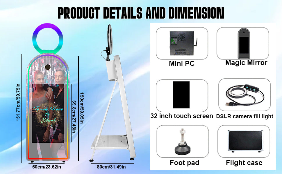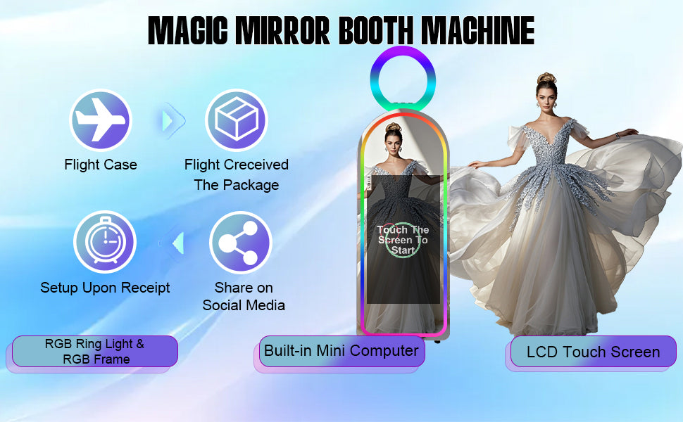 High Quality Flight Case: Our magic mirror photo booth made by strong metal and tempered glass, and the packaging uses protective film and foam padding + portable flight case, which is very stable and protects our products from damage.