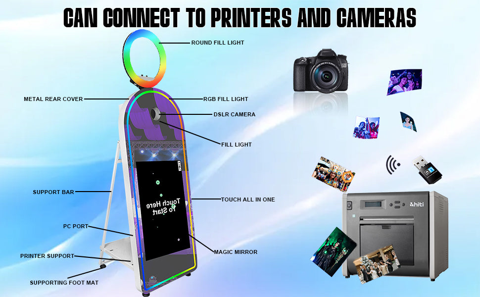 Win10 System for Photobooth: This magic mirror photo booth with cool shape, built-in capacitive Mini PC of i5 8GB 256GB; can be configured with different languages; With plug in connection to network function, WIFI connection to network function, WIFI or wired connection to printer function;With downloadable software function and Instant Photo Printing Feature.