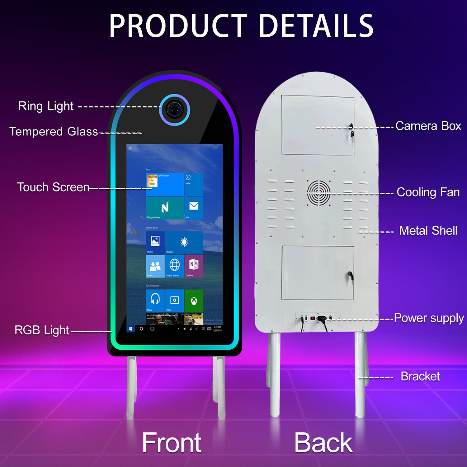 MIRROR TOUCH SCREEN: Photo booth is equipped with a 32-inch mirrored capacitive touch screen, a built-in Windows 11 PC( Intel i5 ,8GB RAM, 256GB SSD ) and pre-installed with DSLRBooth Basic Edition software, which supports templates for shooting photos, GIFs, and videos. This DSLR photo booth also supports connecting a Camera and Printing. Compatible with Canon, compatible with Nikon and other brands of DSLR cameras and printers (camera and printer optional), you can instantly share or print after shooting
