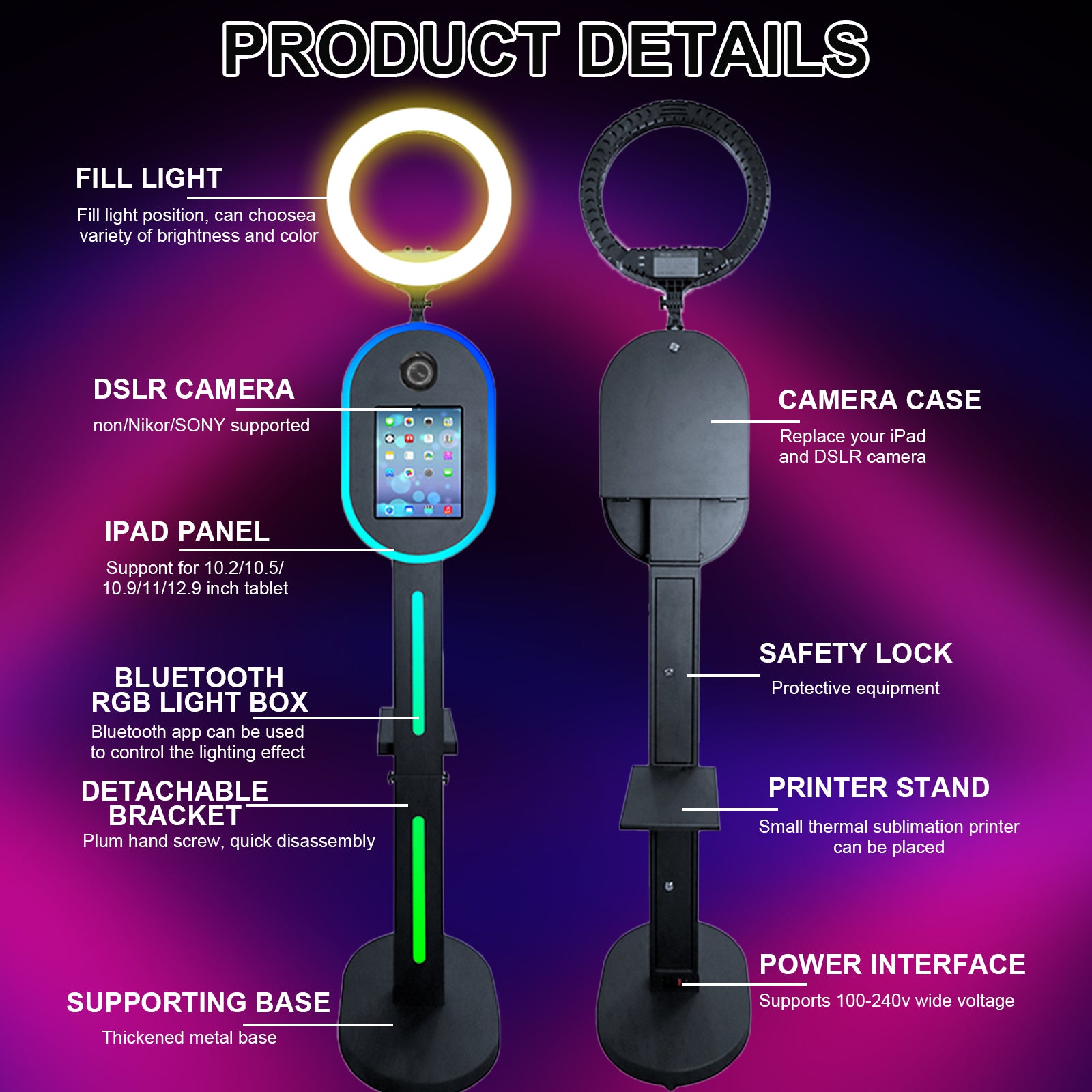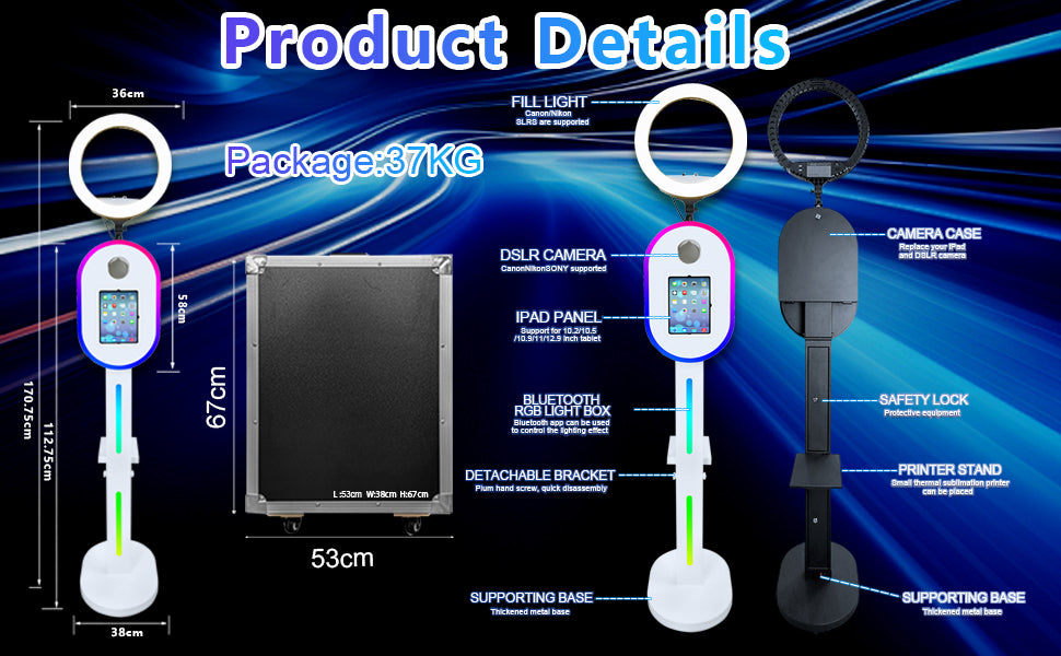 Easy to Carry & Durable: Photo booth machine for IPad is made of sheet metal material, which is not easy to rust and deform, support long term use. The whole is designed with a detachable structure and equipped with a sturdy flight case, more portable and can be carried around easily.