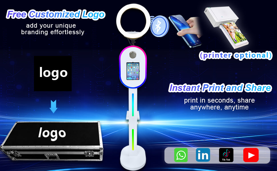 Logo Customization Include: The photo booth machine support customized logo on your flight case. If you want to customize the logo, please se-nd us the logo file.