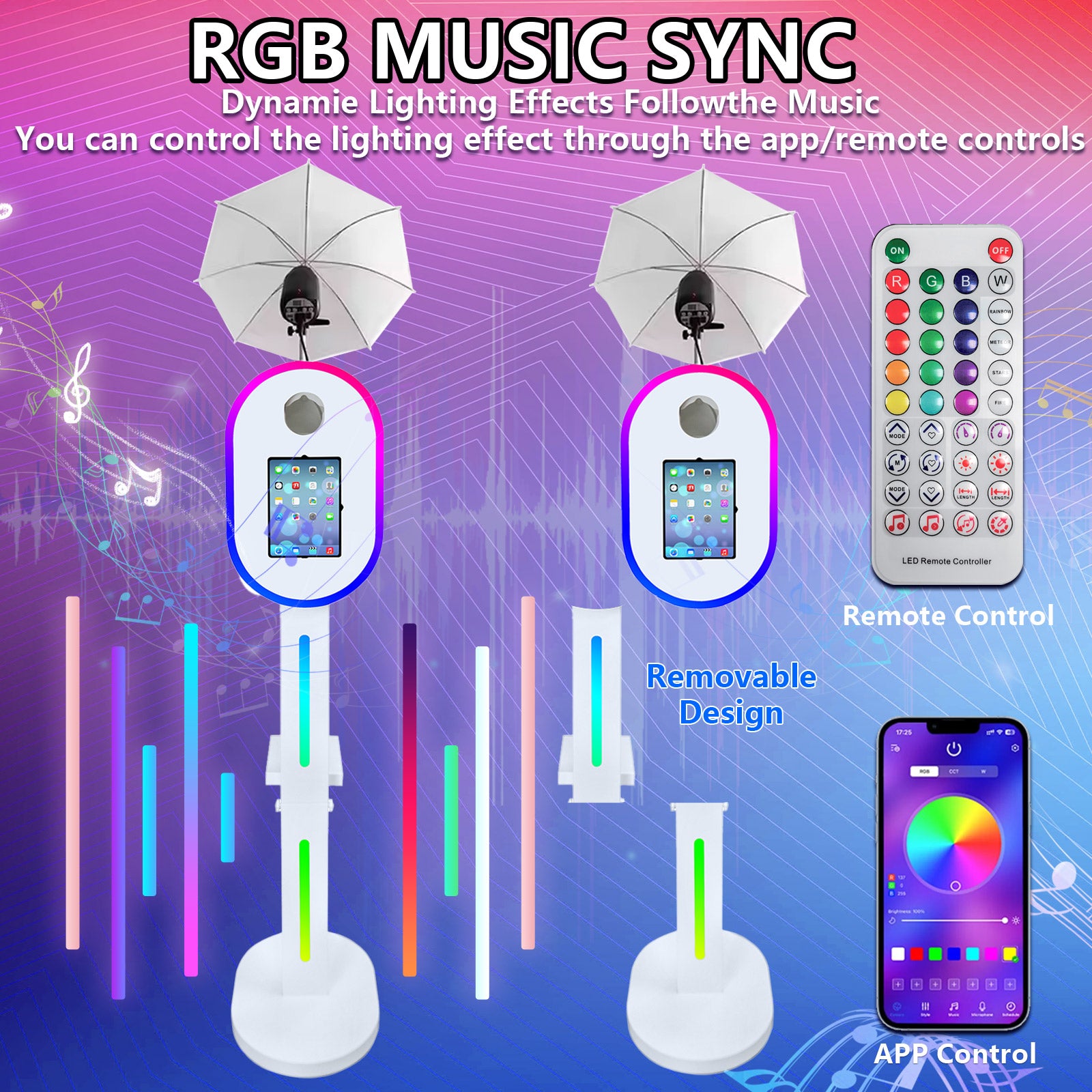 APP & Remote Control: The portable photo booth ring light and light box has RGB mode, more than 20 colors. Use the remote control or APP to adjust the color of the ring light. It supports single color, mixed color or random change. There are 1%-100% adjustable brightness, color temperature (2700K-6500K) and brightness (0%-100%) can be selected.